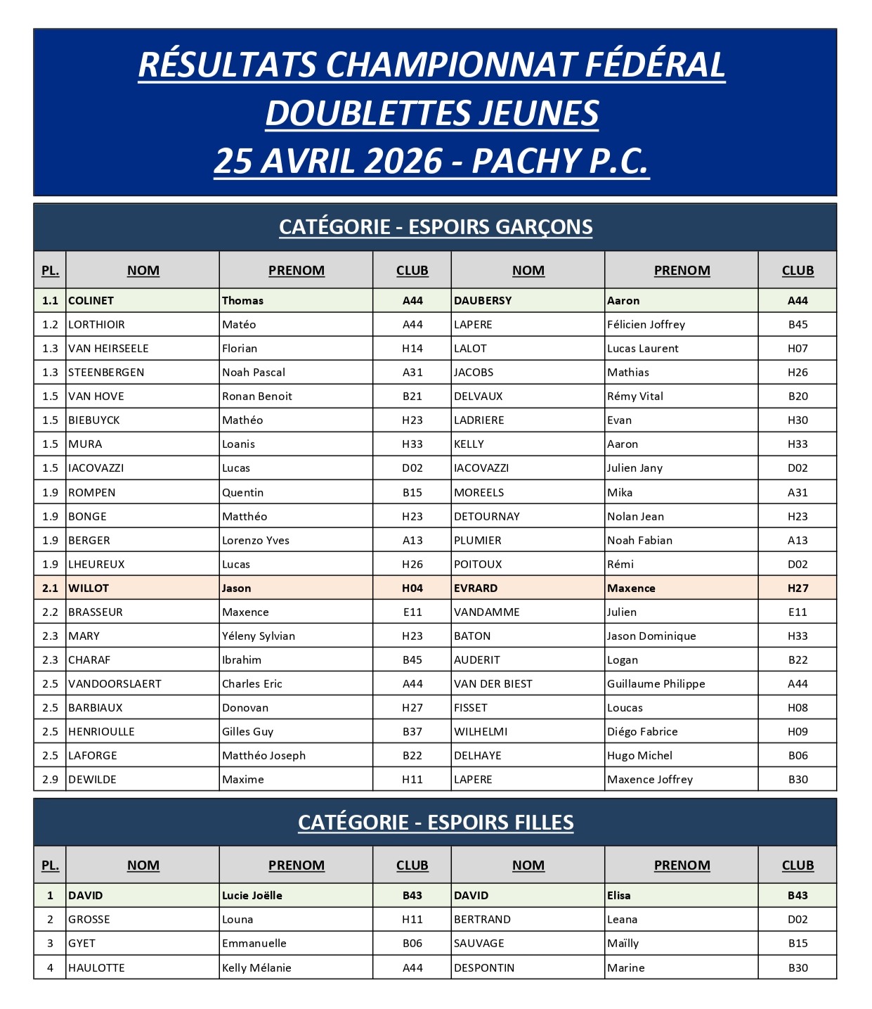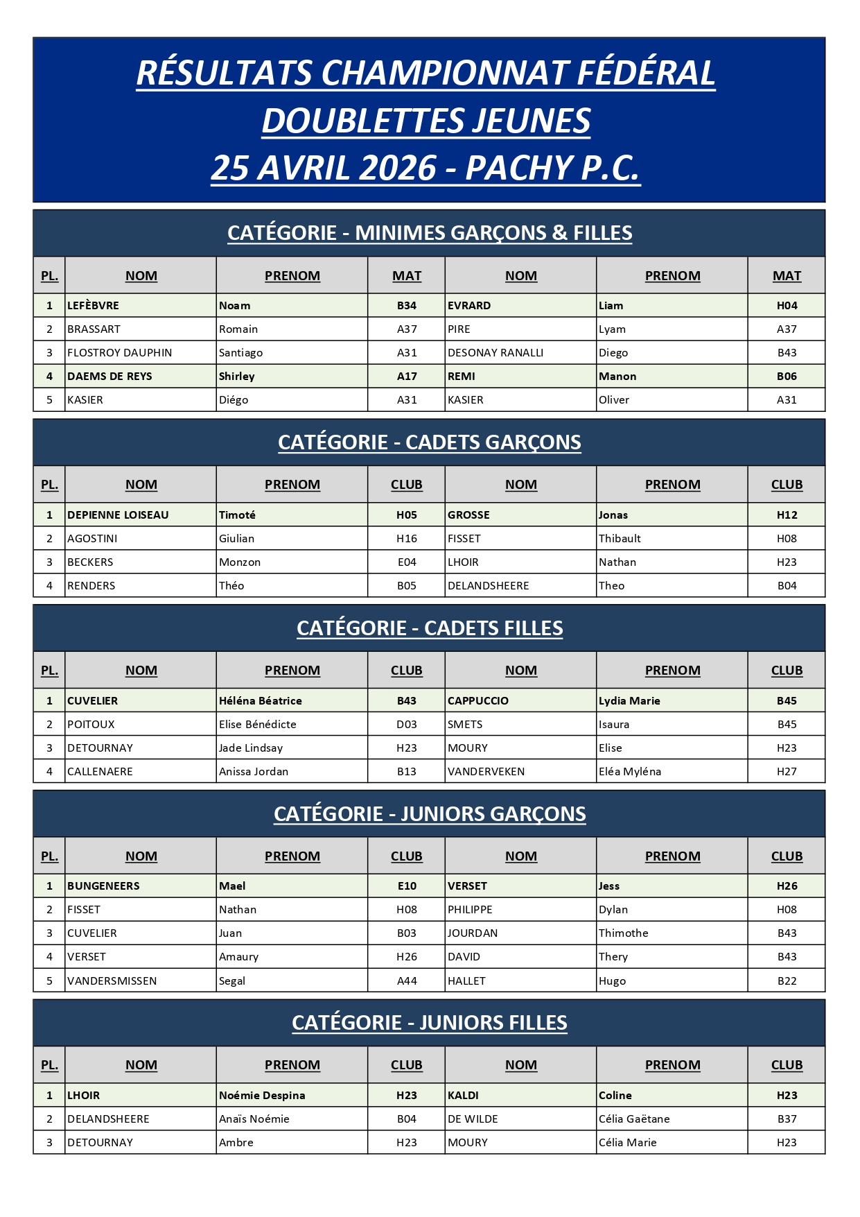 RESULTATS et CLASSEMENTS CHAMPIONNAT FEDERAL JEUNS du 25 AVRIL 2026