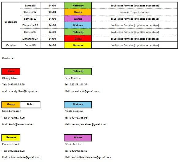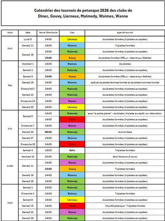 CALENDRIER des TOURNOIS de PETANQUE ETE 2026 des CLUBS de DINEZ, GOUVY, LIERNEUX, MALMEDY, WAIMES, WANNE