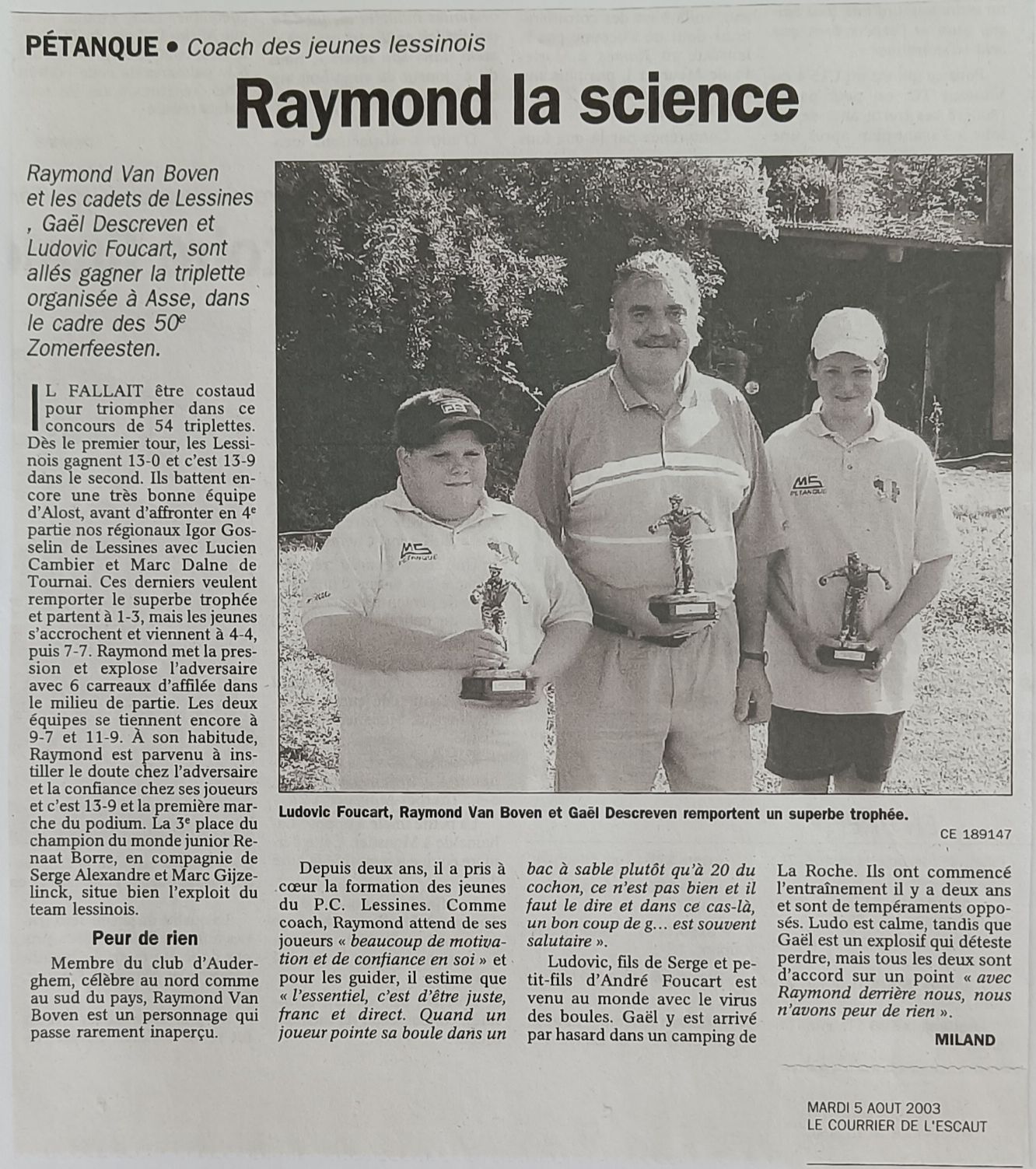 Ce jour-là, c'était un 20 juillet 2001 et l'on jouait le traditionnel "Tournoi des boules nationales" aux Pieds Tanqués de Leuze-en-Hainaut. Parmi les 250 joueurs (une mêlée jeunes - de 12 ans, une doublette vétérans et une triplette nocturne) il y avait Louis Lefrere de La Forestoise que ses amis appelaient Roudoudou. Un grand monsieur tout sourire et en costume cravate, ce qui n'est pas fréquent, en compagnie de Joseph Carreau de la Vlaamse Liga. Des Bruxellois en province, c'était sympa, d'autant que Louis avait gagné La Nismoise en 96 et la triplette de Dunkerque en 2000. Un fameux tireur qui va se classer second derrière Jean-Pierre Desse et Francis Houel et devant Claudy Maes et Louis Devoghel.